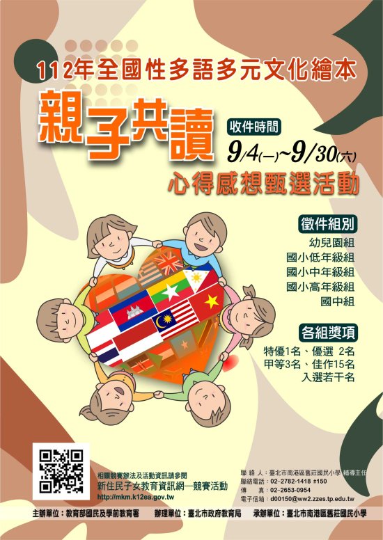 2、 | 若學校統一報名請以學校為單位,統一將上述已簽名之授權同意書寄送臺北市南港區舊莊國小輔導(11572臺北市南港區舊莊街一段100號),請載明報名「全國性多語多元文化繪本親子共讀心得感想甄選」。 |
