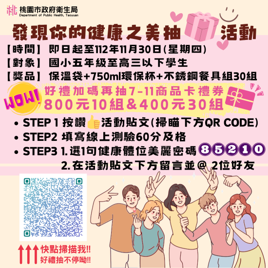 (一) 活動網址:桃園市社區營養推廣中心Facebook專頁「發現你的健康之美」抽獎活動(https://reurl.cc/bldREy)。