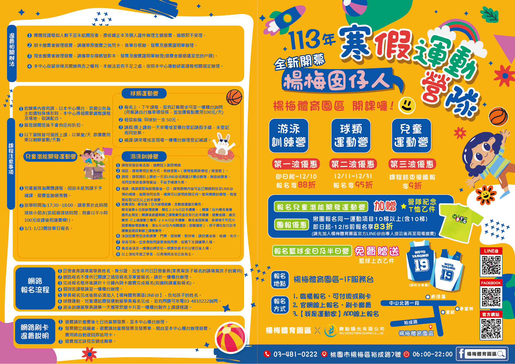 二、 本市楊梅體育園區現由本局委託舞動陽光有限公司營運管理,該公司規劃辦理113年兒童冬令營活動,藉由營隊學習及體驗運動課程相關知識與技巧,帶給求學階段孩子不同的學習空間,進而彼此分享、關懷、信任與成長。