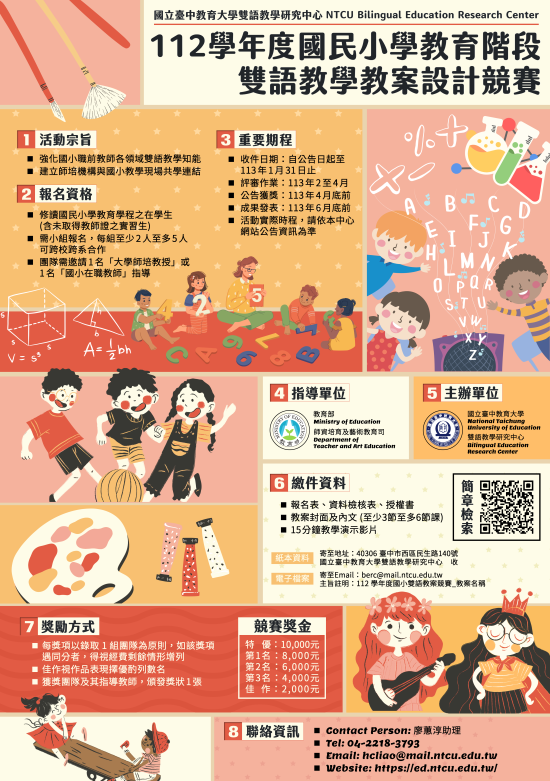 | 主旨: | 函轉國立臺中教育大學辦理「112學年度國民小學教育階段雙語教學教案設計競賽」簡章一案,請鼓勵所屬教師踴躍投稿,請查照。 |