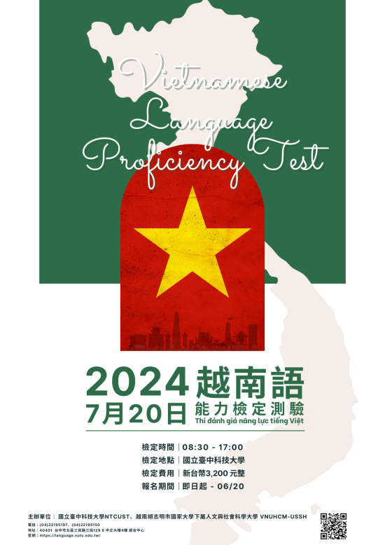 四、 | 檢定項目包含聽力、閱讀、寫作及口說等四項測驗。簡章及報名資訊,請至國立臺中科技大學語言中心網站「檢定測驗」專區https://language.nutc.edu.tw/p/406-1079-114000,r156.php查詢。 |
