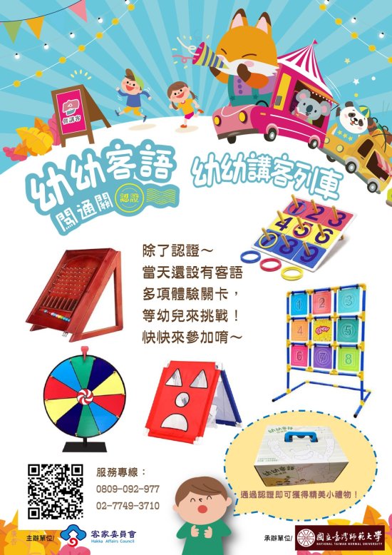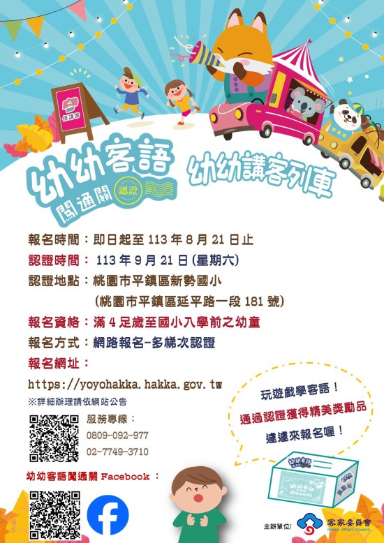 主旨: | 函轉客家委員會委託國立臺灣師範大學辦理「113年度幼幼客語闖通關多梯次認證-幼幼講客列車」活動,桃園市場次相關資訊,詳如說明,請查照。 |