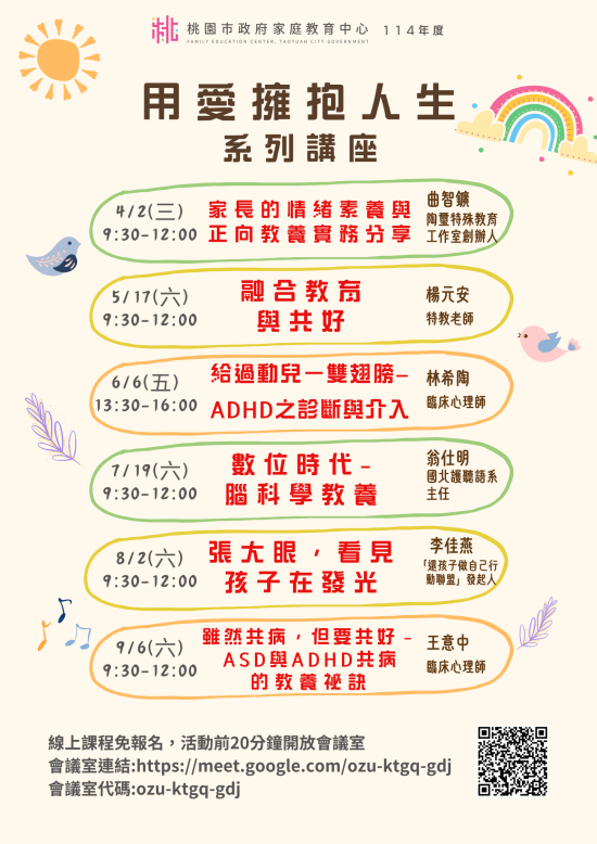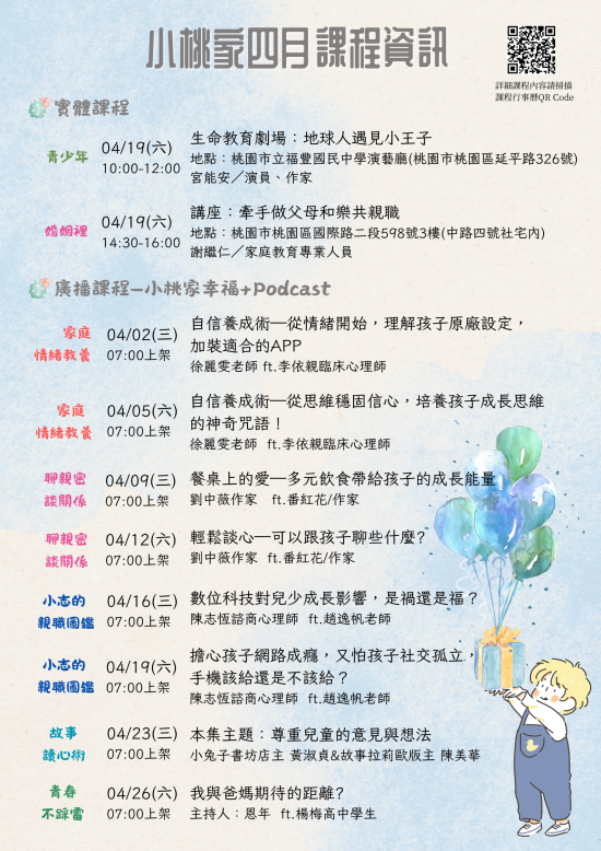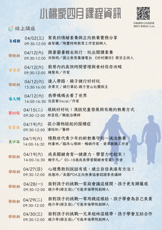 二、 旨揭課程詳細資訊,請見中心課程行事曆(https://reurl.cc/xlGyGL)或追蹤「桃園市政府家庭教育中心」FB粉絲專頁;另倘有家庭教育個別化服務需求,可撥打4128185家庭教育諮詢專線,本市市民可申請小桃家線上諮詢室(預約連結:https://reurl.cc/oZWOY5),由中心媒合專業人員透過線上會議室提供服務。