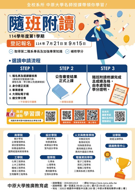 一、 | 本校開放114學年度第1學期學士、碩士學分專班(隨班附讀),報名登記至114年9月15日止。 |