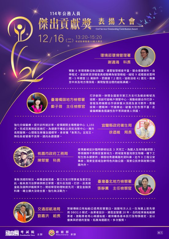 主旨: 有關「114年公務人員傑出貢獻獎表揚大會」電子海報,請查照並協助公告。