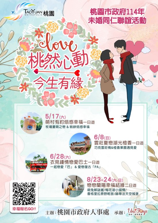 主旨: | 本府訂於114年5月至8月期間,辦理114年「桃然心動 今生有緣」未婚同仁聯誼活動,請轉知並鼓勵所屬符合資格之同仁踴躍報名參加,請查照。 |