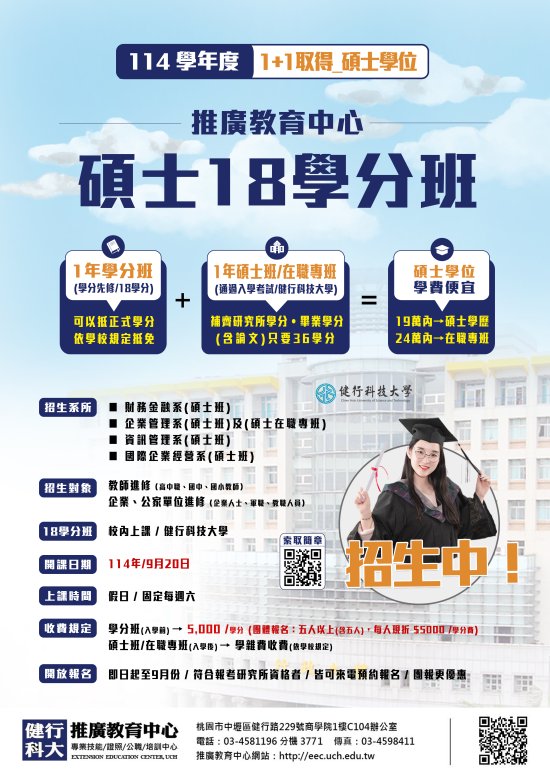 主旨: | 函知本校推廣教育中心辦理「碩士18學分班」相關資訊,敬請惠予公告周知並鼓勵所屬(轄)人員踴躍報名參加,請查照。 |