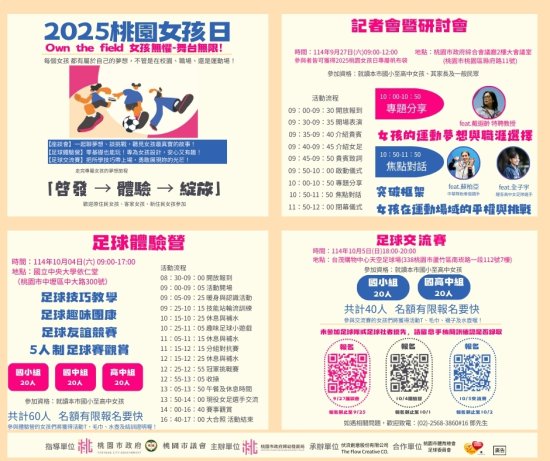 一、為響應聯合國訂定10月11日為「女孩日」重視女孩投資與培力精神,今(114)年本局將延續深受好評的「運動性別平權」主軸,鼓勵嘗試更多元的運動項目,強化社會對女孩培力之認識與支持,並促進其健康發展與自信展現,辦理活動如下: