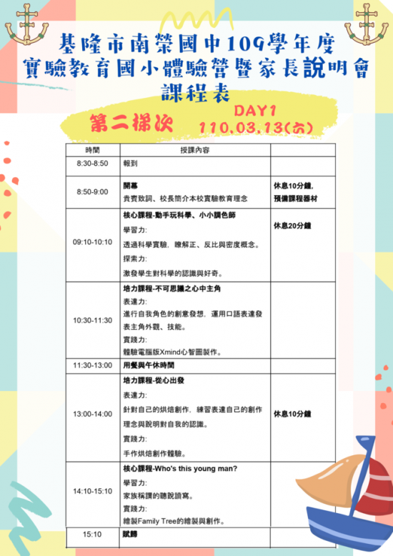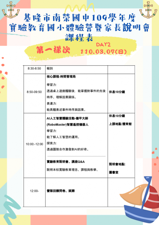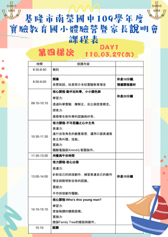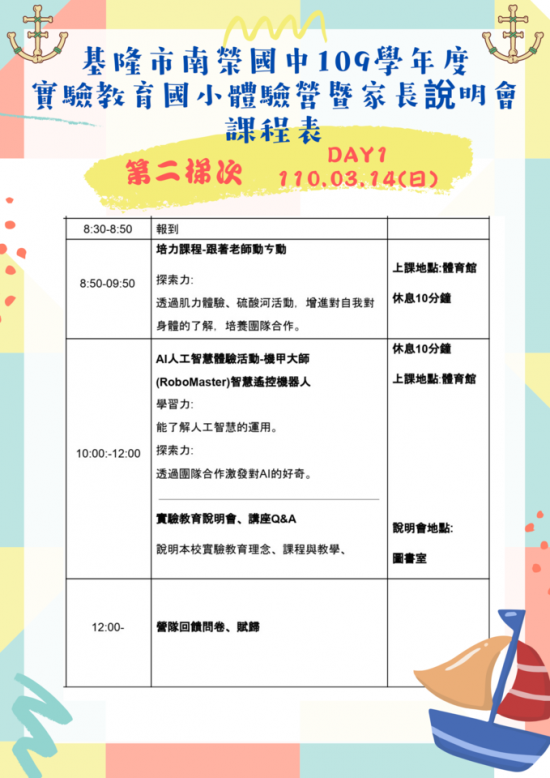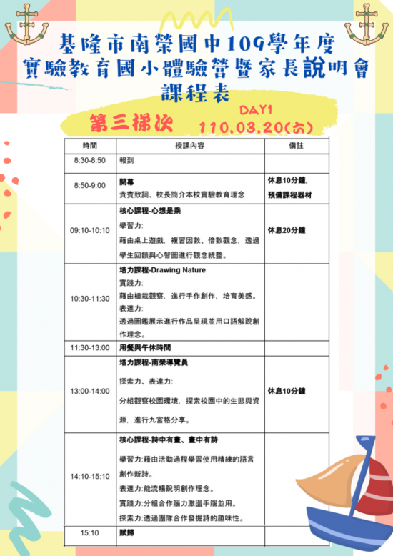 二、 | 基隆市南榮國中自109學年度轉型為學校型態實驗教育學校,以未來力教育作為特殊教育理念,連結既有領域課程,發展出「學習力」、「表達力」、「實踐力」與「探索力」四大課程架構之培力課程,期培養學生習得「適應未來能力」與「創造未來動力」;另為擴大推動實驗教育效益,使學生及家長透過課程體驗與理念說明,瞭解該校實際課程推動情況與做法,特規劃辦理學生體驗營與家長說明會。 |