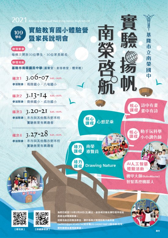 (四) | 本次體驗活動全額免費,倘有相關問題,請逕洽南榮國中葉老師(02-24282188#18)或至學校網站查詢(https://nrjh.kl.edu.tw/632)。 |