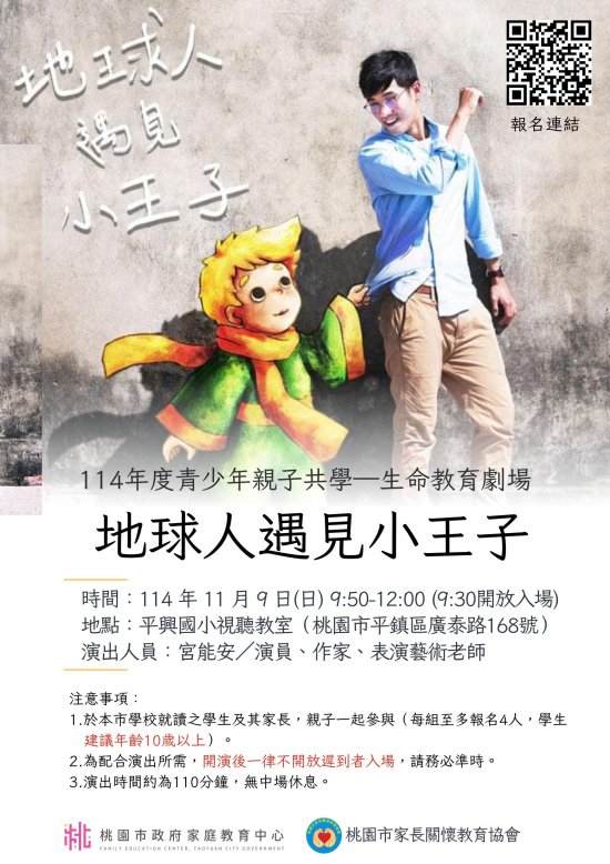 | 主旨: | 檢送本中心與桃園市家長關懷教育協會合作辦理114年度「青少年親子共學—生命教育劇場:地球人遇見小王子」宣傳海報1份,請協助公告宣傳,請查照。 |