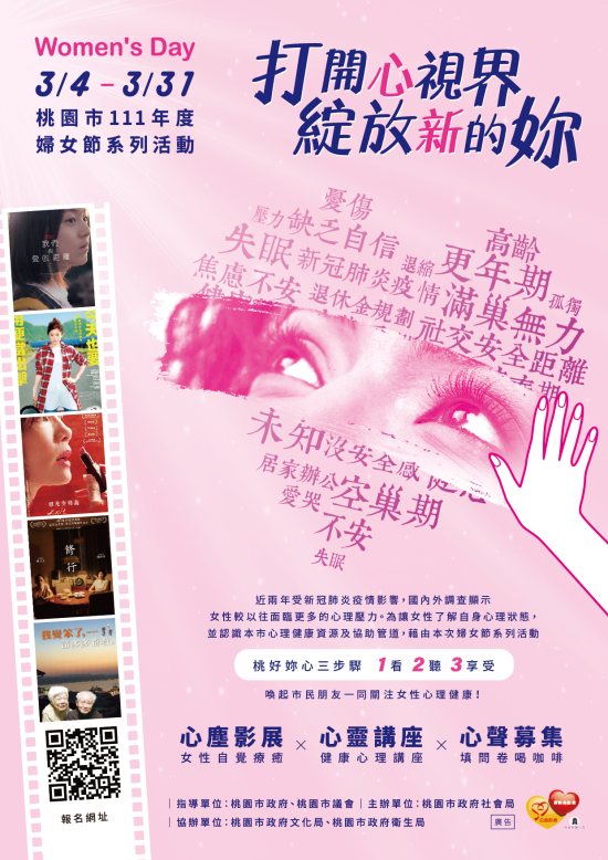 二、 近兩年受新冠肺炎疫情影響,國內外調查顯示女性較以往面臨更多的心理壓力,本市111年度婦女節系列活動以關注「女性心理健康」為主軸,透過「桃好妳心 三步驟 1看2聽3享受」辦理心靈講座、心塵影展及心聲募集活動,讓女性了解自身心理狀態,並進一步認識心理健康資源及協助管道。