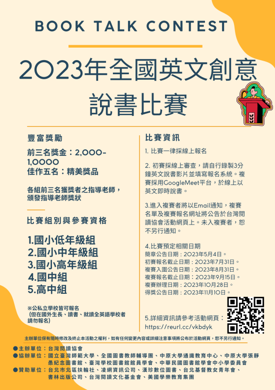 一、 本案係台灣閱讀協會舉辦「2023全國英文創意說書比賽」,結合雙語教育及閱讀教育,今年已邁入第二屆,為鼓勵各級學校學生參與及教師指導,主辦單位備有前三名新臺幣2,000元整至1萬元整獎金及佳作五名致贈精美獎品;各組前三名獲獎學生之指導老師頒發獎狀。