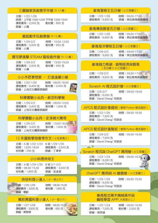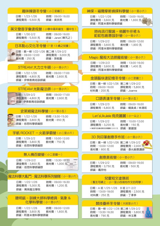 一、為提倡兒童多元化之學習體驗,本校推廣教育處開設旨揭系列課程,請鼓勵貴校學生踴躍參加。