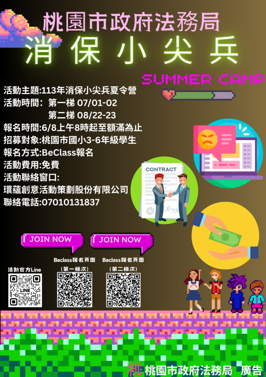 六、本活動免費報名參加,無須繳交任何費用,因名額有限,如有意願者,請從速報名,以免向隅。檢附113年消保小尖兵夏令營DM及活動課程表1份。
