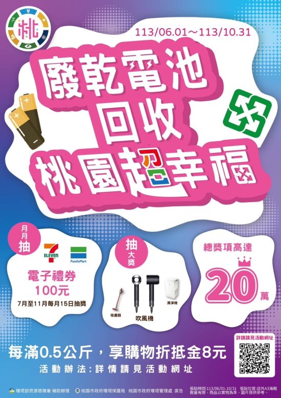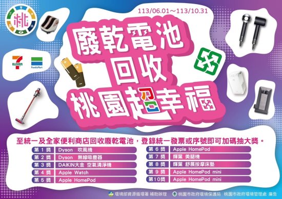 | 一、 | 旨案活動係本局為推廣廢乾電池多元管道回收,與本市各區統一超商及全家便利商店辦理旨案活動,活動期間持廢乾電池至2大超商回收,享有8元購物折扣金,登錄使用折抵消費發票即可參加「月月抽:超商百元電子禮券」活動,最後還可參加抽大獎機會,期盼藉由旨案活動,加強宣導廢乾電池回收,並減少對於環境及健康的危害。 |