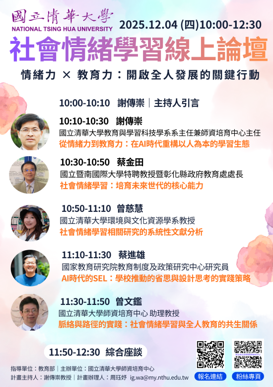 主旨: 轉知國立清華大學辦理「社會情緒學習線上論壇-情緒力 × 教育力:開啟全人發展的關鍵行動」線上論壇,請查照。